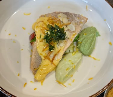 (Image reference: Trout fillet topped with almonds and sauce, served with two smooth vegetable purees.)