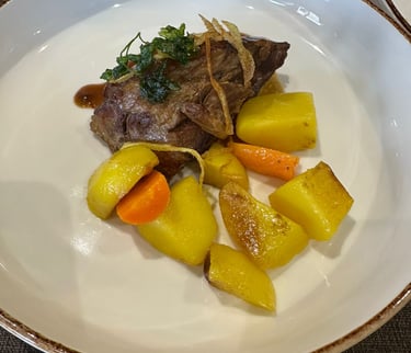 (Image reference: Veal with root vegetables — soft yellow potatoes, carrots, and a beautifully cooked cut of veal.)