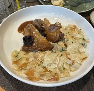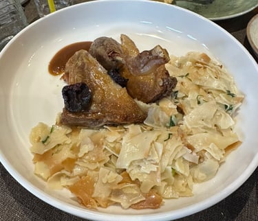 (Image reference: Golden-roasted duck with traditional petka pasta, lightly herbed and delicately sauced.)