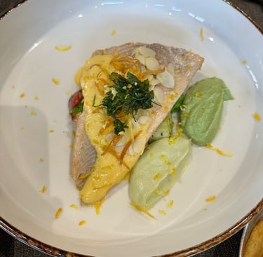 Freshwater trout from Lake Ohrid is a must-try in Pogradec, and Image 3 reflects the kitchen’s modern approach to this classic ingredient. The fillet was tender, topped with a creamy sauce, citrus essence, and almond flakes for texture, plated alongside green vegetable puree for balance and freshness.